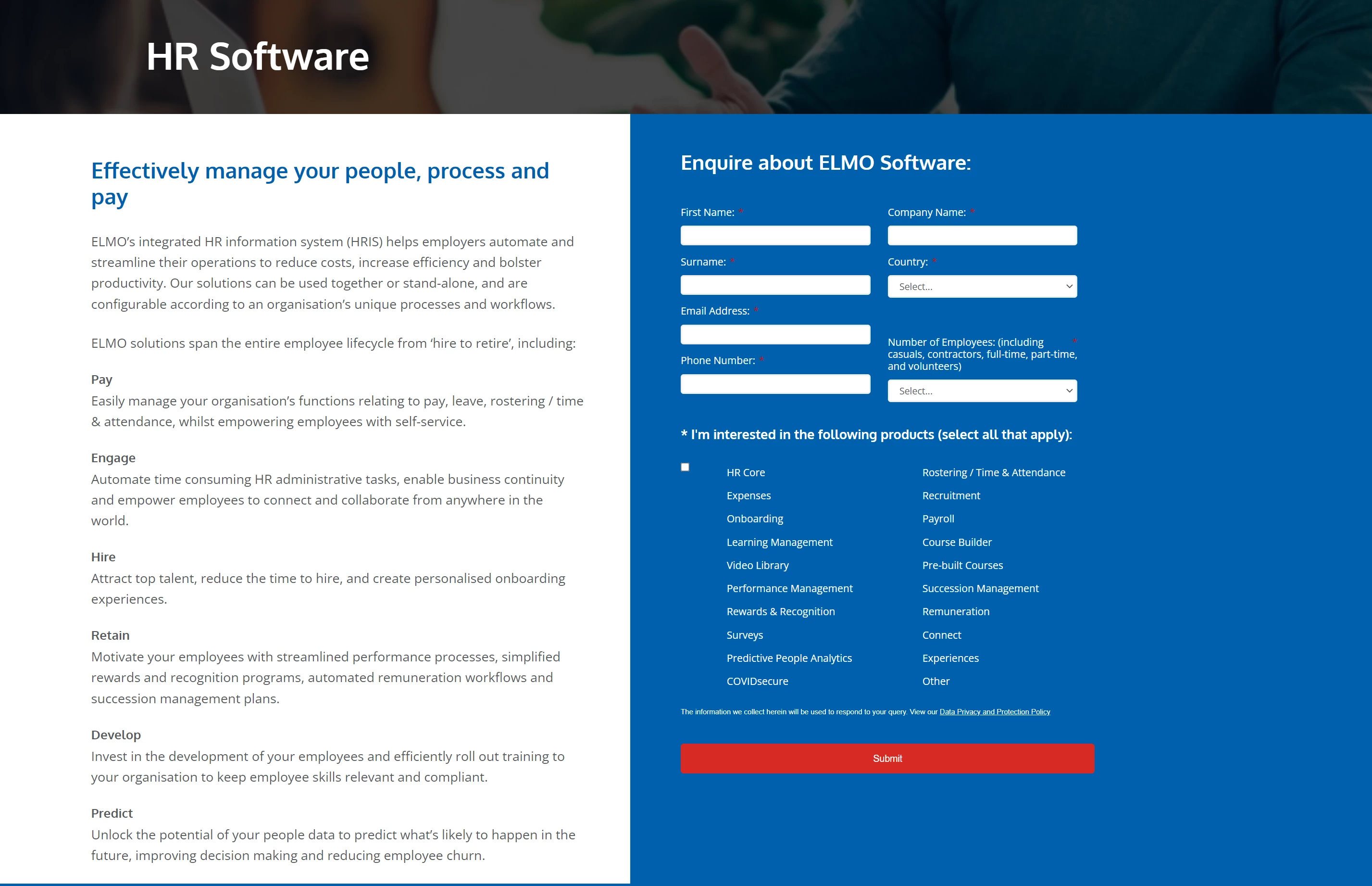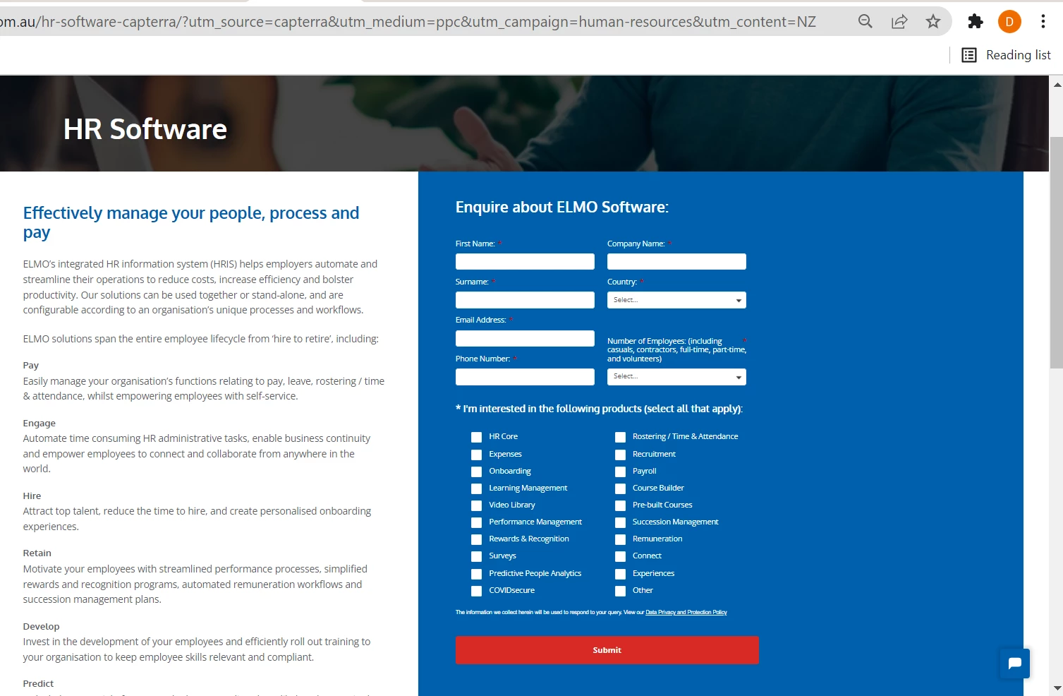 We have encountered an error with the form on this page - https://elmosoftware.com.au/hr-software-capterra/?utm_source=capterra&utm_medium=ppc&utm_campaign=human-resources&utm_content=NZ