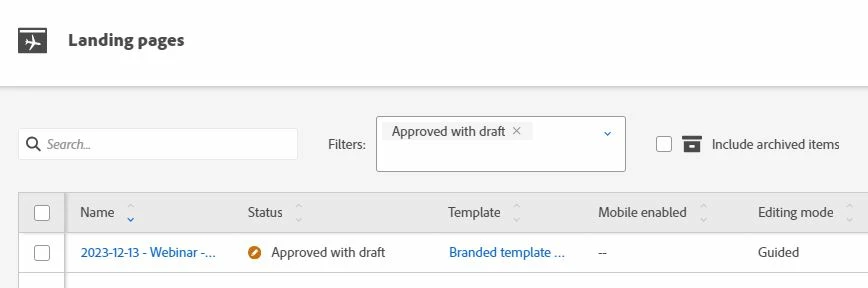 When browsing or querying assets using the REST API (GET /rest/asset/v1/landingPages.json || /rest/asset/v1/landingPage/{{id}}.json) , the response for the status key does not have the value approved with draft :