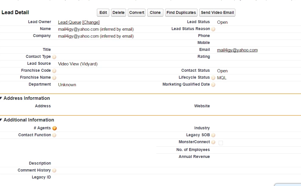 We have some leads coming through that we cannot figure out where they are coming from. It seems we have more than one record for the lead and the email address is the same. For some reason it seems that it is not recognizing them to merge them together. The company name is a email address with (Inferred by Email) along with the name. The lead is watching some vidyard videos but it seems to be creating a new lead for them and not adding to the existing contact where the emails are the same. It is also creating a milestone "Tradeshow" yet that interesting moment only applies to a Lead Source of "Tradeshow". Anyone else having strange leads come through or issues with vidyard and SFDC sync?