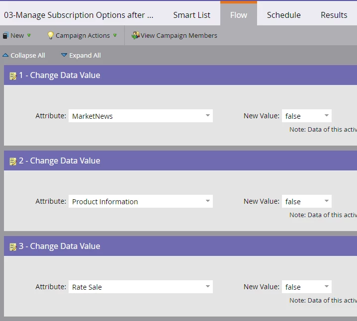 Looking at your initial screenshot, my comment would be that this is inverse logic which makes it more difficult to think about and understand. Given that it's a subscription centre, you'd normally expect to be able to opt IN to things, rather than just be presented with a list of things to opt OUT of. For example - presenting an option that says 'I want to opt out of product information' means that the customer has to do a positive action (tick the box) to get a negative outcome (unsubscribe). It isn't technically wrong, but it does make understanding all of the smart campaigns and processing at the back end harder to grasp.