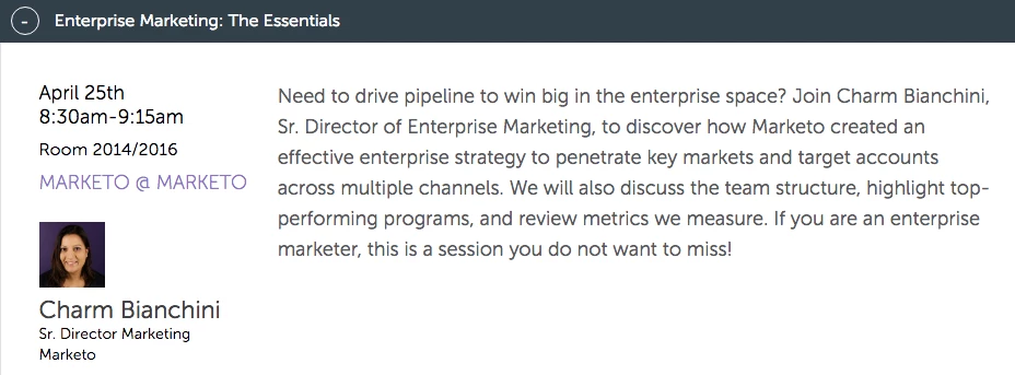 Looks like this session has changed to 'Account Based Marketing: Marketo's Secret Sauce' as it is the same day & time and the same presenter
