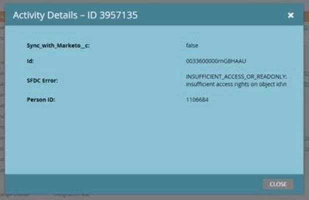 However, I am troubleshooting an issue currently where the change in the field  on the Marketo side does not propagate to SFDC. The checkbox in SFDC is remaining true and then instead of just simply stopping the sync, the record stops sync but also gives a recurring error message in the activity log.