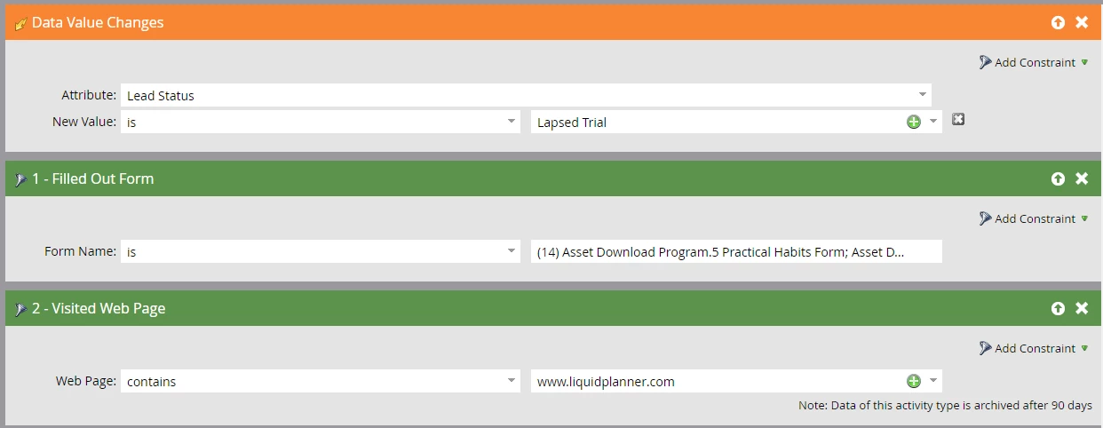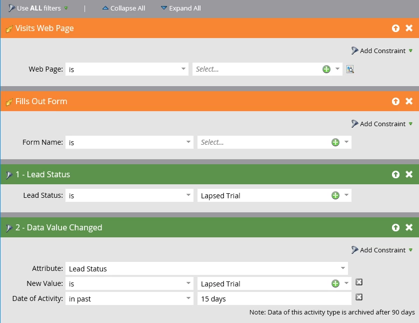 Here's what I'd like to do: If someone's status gets updated to lapsed trial and then in the future, after two weeks, let's say, they fill out a form or visit the website a minimum number of times, they get pushed back to our sales team to work. However, I'm having a hard time figuring out the right syntax for the smart list
