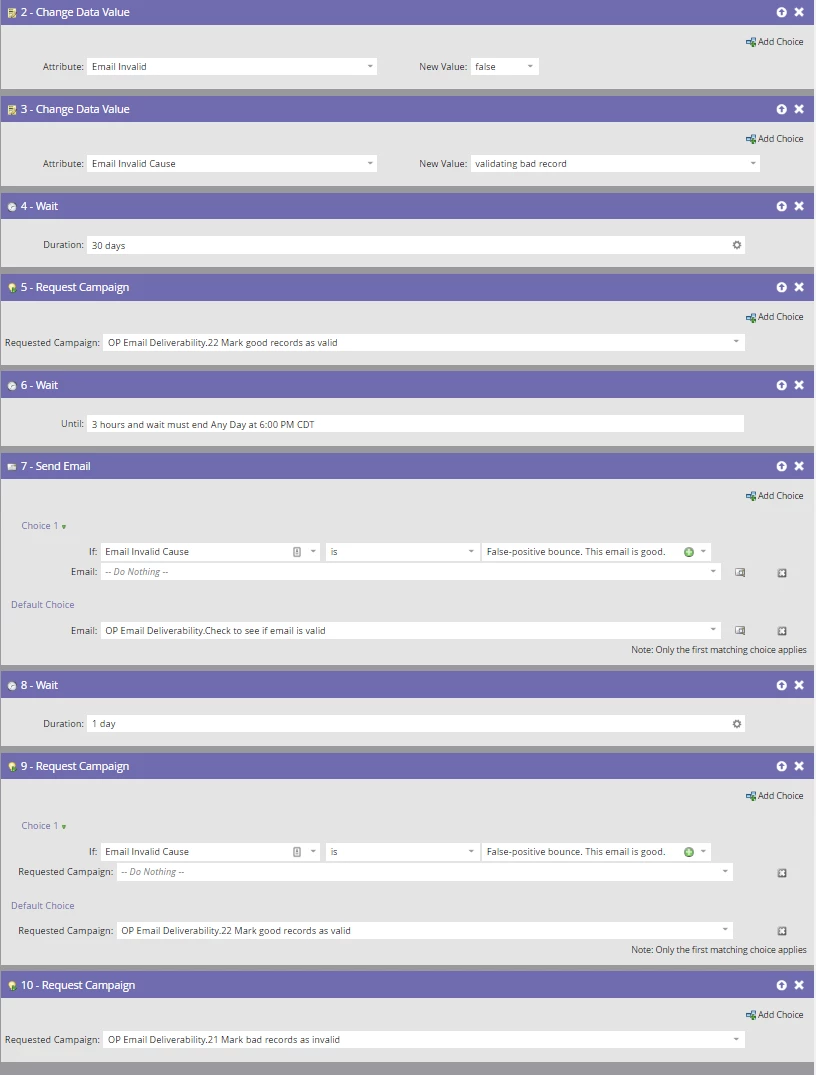 Everyone else goes to step 10 which sends them to the "Mark bad records as invalid" campaign.