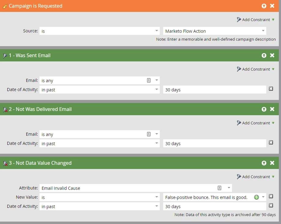 Description: Marketo marks emails invalid via hard bounce, spam bounce or technical bounce. Some people get a false-positive hard bounce and stop receiving emails they want. This campaign tests recent invalid emails who have recently opened or clicked, who haven't already gone through this test process and excludes category 1 (spam) bounces. We "Email Invalid" to true for these records and test for 30 days to be sure they're bad. After the 30-day wait step the "Mark bad records" campaign will request all the members from this campaign and check records sent to but not delivered to and then the flow step will mark these emails as legitimately invalid. Anyone delivered to will be ignored and continue receiving emails.