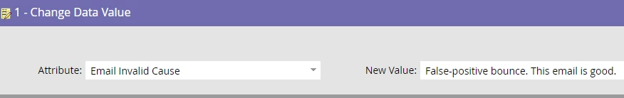 Step 5 sends them to the "Mark good records as valid" campaign which changes their "Email Invalid Cause" field to "False-positive bounce. This email is good." if an email was successfully delivered to in the past 30 days.
