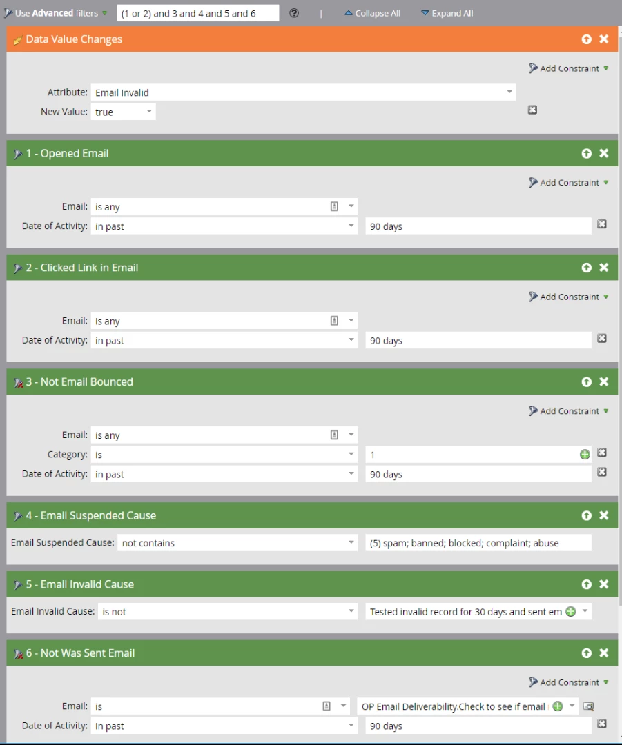 - Step 5 basically says exclude bad records that have already been tested. The "Tested invalid record for 30 days and sent email was not delivered" value is set in another smart campaign.