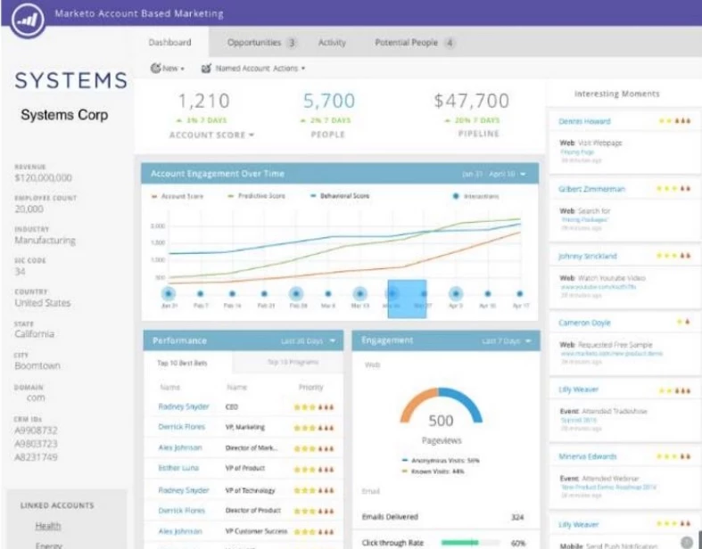 Each named account also has its own dashboard. The dashboard is tabbed similar to a lead detail record (although much prettier) and gives some useful high-level metrics such as the number of people from this account in the database, open pipeline, trending account engagement over time, account-wide interesting moments, and top ten best bets for people in the account.