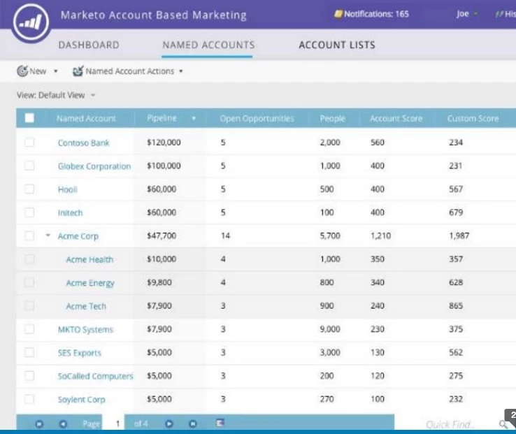 One simple but powerful innovation is a new grid of named accounts, showing information like pipeline, account score, and other account-based data in a single table. Marketo makes it pretty easy to create tables of lead information via smart lists, but grouping this data by account is a challenge. Not with ABM.