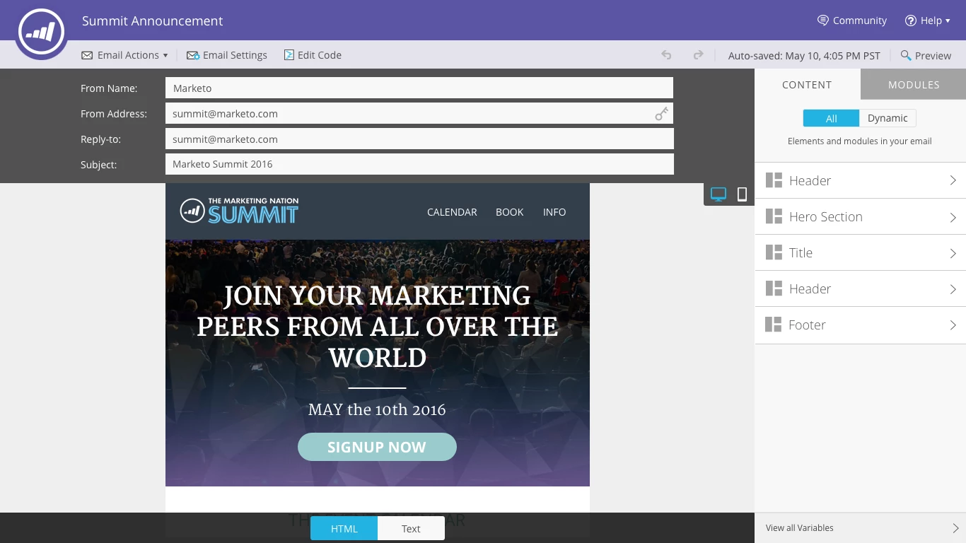 The new email editor incorporates the best of the new innovations in the landing page editor and then leapfrogs it. Variables come to email as well as “modules,” containing elements like images, videos, text, etc. that can be reordered and moved about with ease.