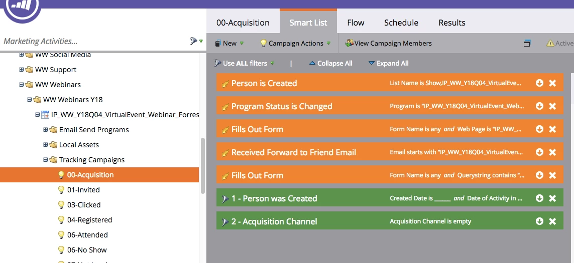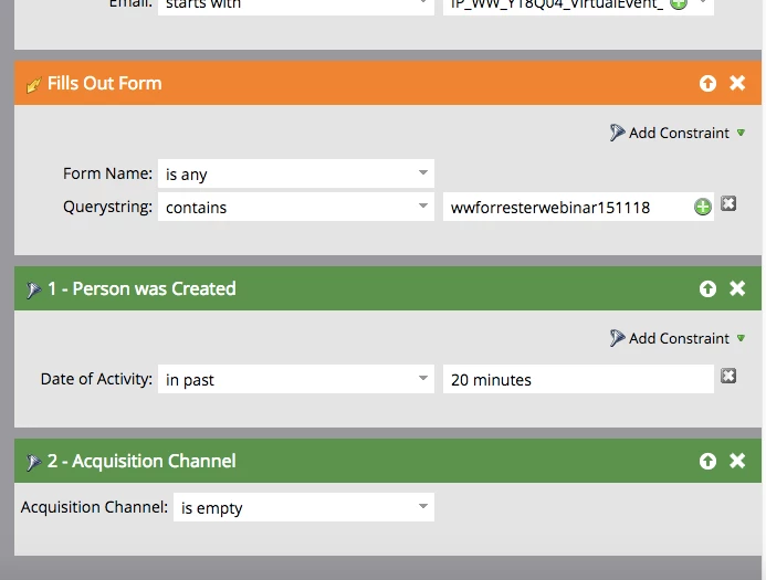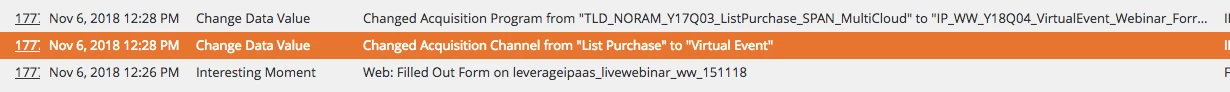 Lately we've discovered that we have programs stealing acquisition credit from other programs. For example, someone first comes in to our database through a list purchase and then at some point later in time registers for a webinar, the webinar will change the acquisition program and channel.