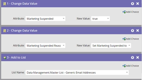 In the flow besides setting the Marketing Suspended field to True, I am going to set a custom field called 'Marketing Suspended Reason' to 'Set Marketing Suspended to True due to generic email address' and all the records to a static list.