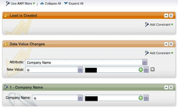 I'm struggling to get a trigger to work. Basically I want the smart campaign to trigger when a contact is added to a certain company so I can run a flow to put that lead on marketing suspend. Right now I have it set up this way to catch leads when they are created for this account or when a contact is moved to this account from a different one: