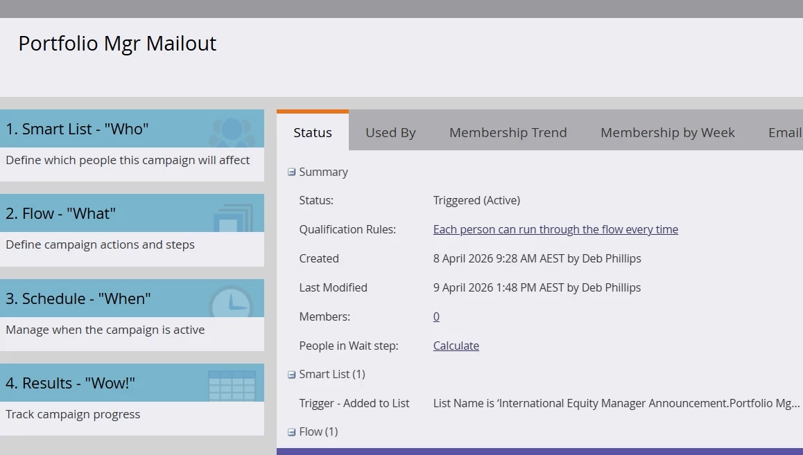 I have setup my smart campaign (cloned off another that was successful and using the same client data to send the emails) , imported client list, set trigger etc, selected Activate and there are no results showing, indicating nothing is going out. can someone assist me through the process to see what i have missed here??