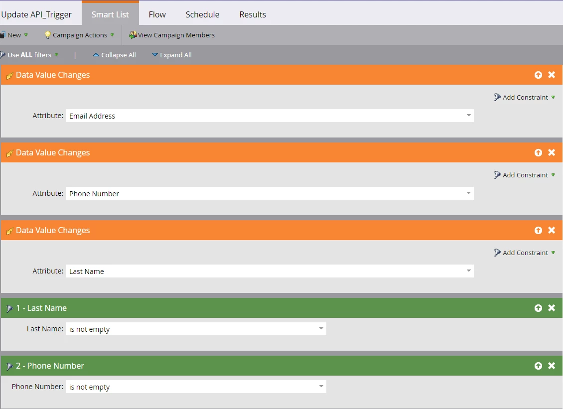 I have a need to update a field (let's call it API_Trigger) based on the values that may or may not change in other fields. This is so I can trigger an API call (see one of my earlier posts). I'd like this done universally as the 'other fields' can get changed in all kinds of locations (both internal to and external to Marketo).