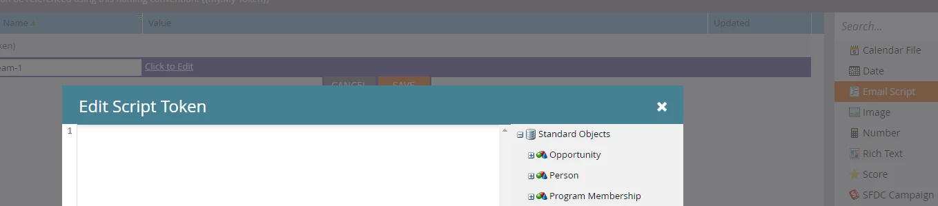Upon creating the Token, and clicking "Click to Edit", an editor pops up with a place for the script on the left, and a list of existing custom fields and objects on the right. The Marketo Developers site has documentation with common examples available, and this won't be a general tutorial on Velocity Scripting, but rather tips on the development process, troubleshooting errors, and some common pitfalls for the starting coder.
