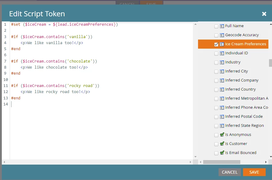 You can see that building a script for this field allows for multiple different matching scenarios to happen simultaneously. While the Dynamic Content could only say one or the other, with the scripts, the marketer can empathize equally with those that like vanilla and those that like chocolate. And here is the first gotcha...