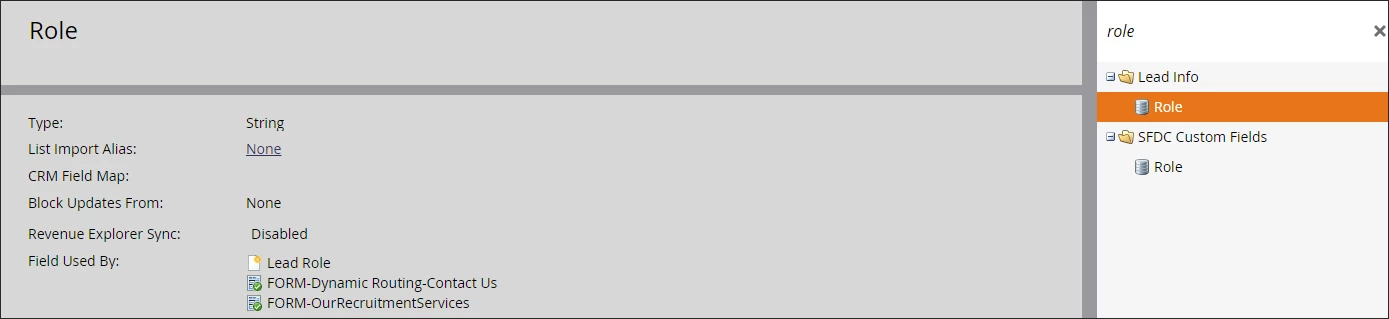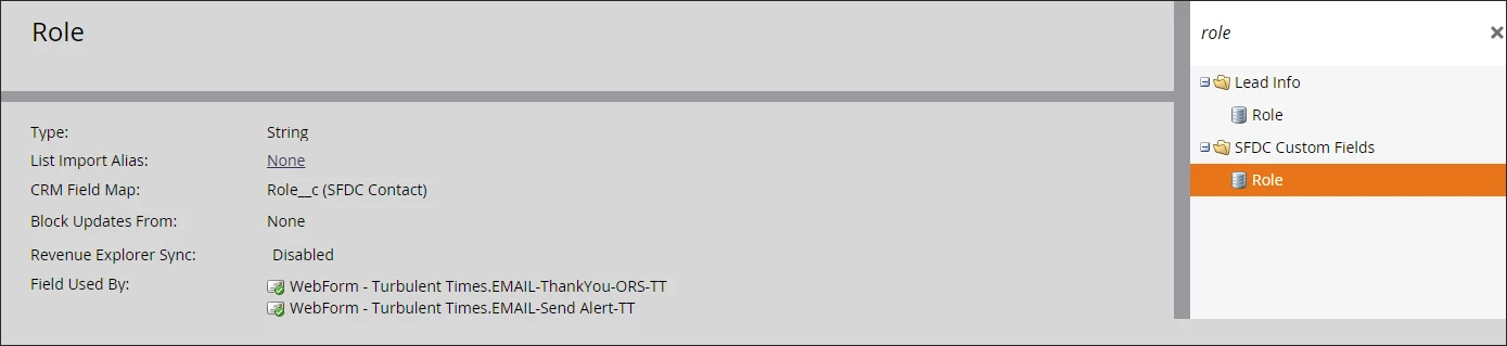 We recently synced Marketo to SalesForce (which is still in the development/testing process). After deciding upon Role Types, I added the Lead.Role field to some forms on our website. I noticed that there were two different Lead.Role fields, one under "Lead Info" and one under "SFDC Custom Fields."