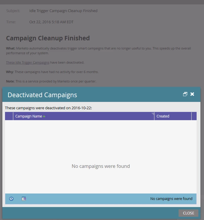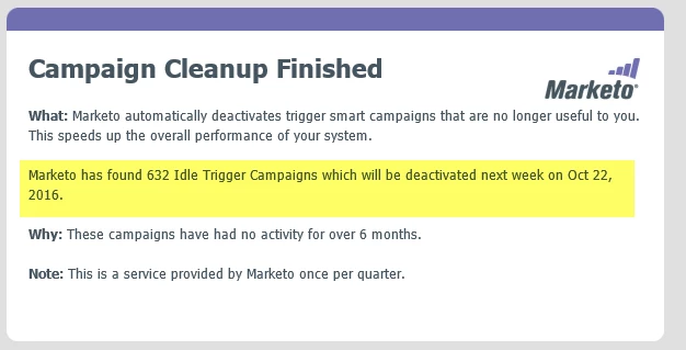 I'm wondering if this is a widespread issue - or something that's just not working in our instance. We had this issue last quarter. When the trigger cleanup completed, we were unable to view the affected campaigns. It's important that we're able to review these each time, since we always find many that shouldn't have been deactivated; and we need to reactivate them. We have a very complex environment (23 workspaces), so we rely on this report. We were specifically told the following by support/engineering back in July: