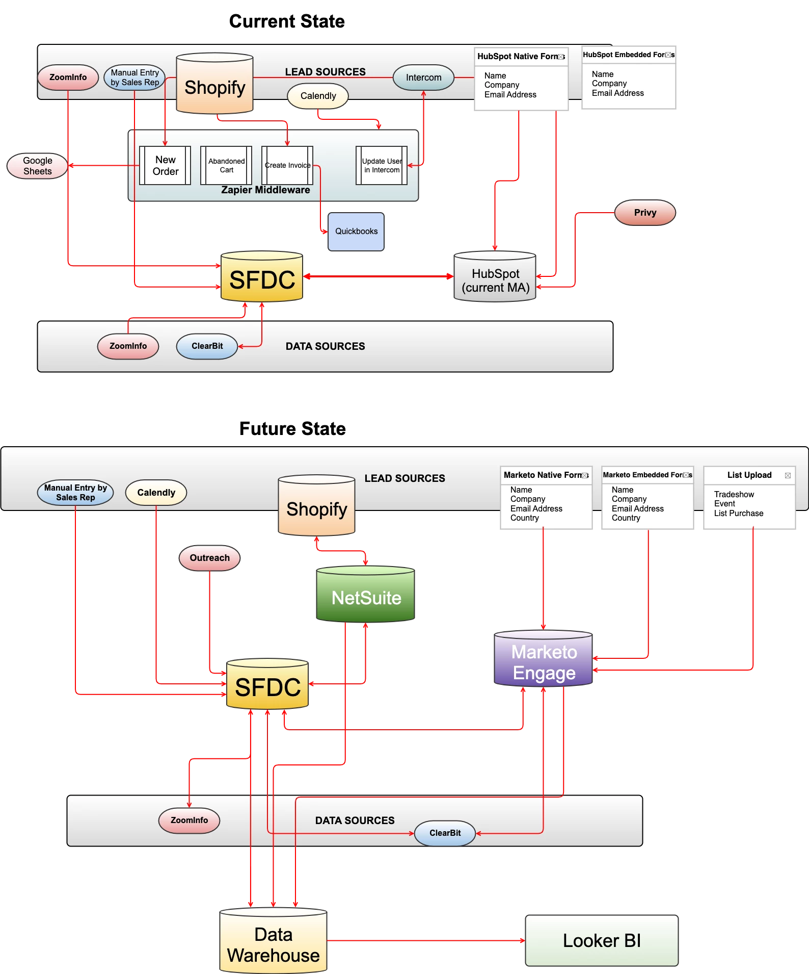 - Download one of the sample data flow diagrams to map out the current state of your tech stack, lead, and data flow, or create your own from scratch. I find it helpful to draw it out on a whiteboard first.
