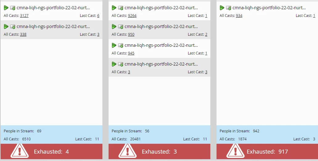 1) How do I interpret the numbers of People in Stream versus Exhausted? It looks like a lot more people have been included in the casts than people that have exhausted content. Are there supposed to be people exhausted after each stream or just at the end of the final stream?