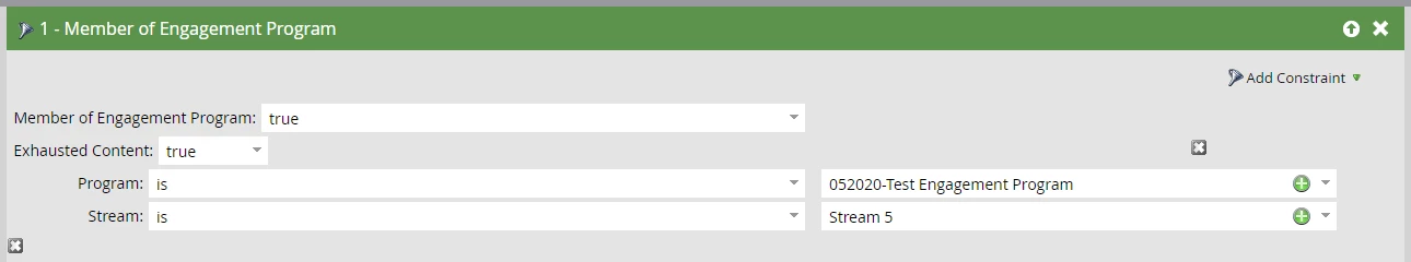 - Create a smart list (use Member of Engagement Program filter, use Program Name, Stream, and Exhausted Content filter constraint to pull all people who're member of engagement program, in X stream and are exhausted)