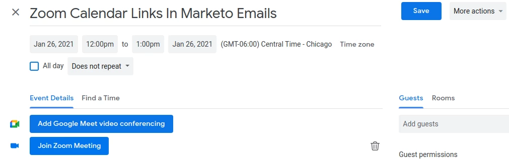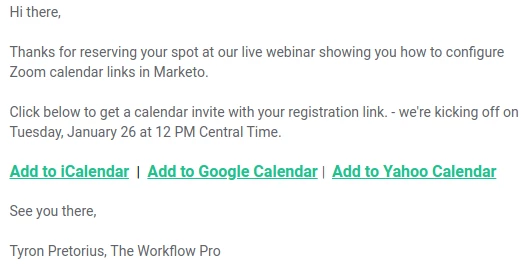 Once you have added Zoom as a launchpoint service and created your webinar event program in Marketo you might be wondering how to set up your registration confirmation email to include “Add to Calendar” links that contain the unique join URL for each registrant. This post will show you how to create these calendar links and how to test that these links are working correctly.