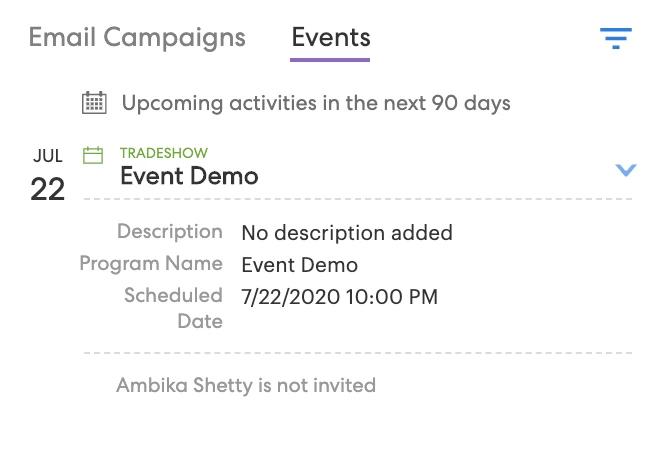 Pretty neat, huh? Let's zoom in a bit to see what is an upcoming event! Sales reps can now see an event their contact has been invited or list of all upcoming events (if their admin has given them access). Looks like this contact didn't make the cut 🙂