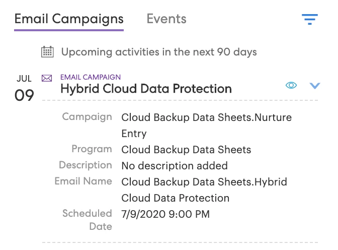 - Upcoming Email Campaigns and Events - Gain visibility into upcoming marketing events and campaigns. Make recommendations based on customer needs and interests. This allows sellers to act as a trust advisor, making conversations more relevant and ultimately drive more pipeline