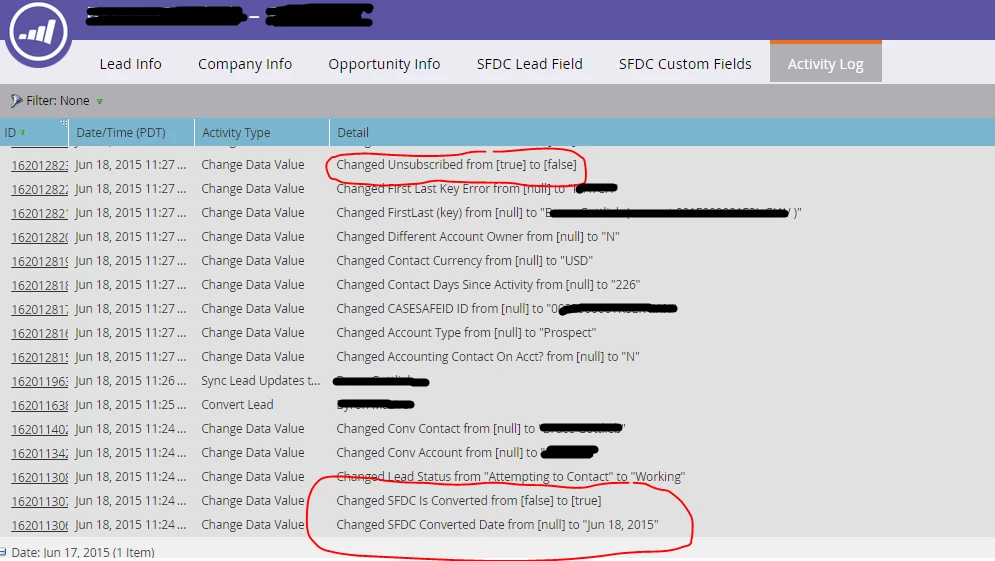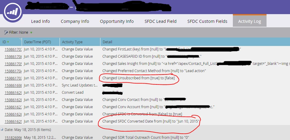 Anyone run into this before? Is there some buried custom rule/workflow or something somewhere in SFDC? When I click on that Activity ID for where Change Data Value: Changed Unsubscribed from [true] to false] the reason shown is "Synched from Salesforce.com..... " with the Source = SFDC