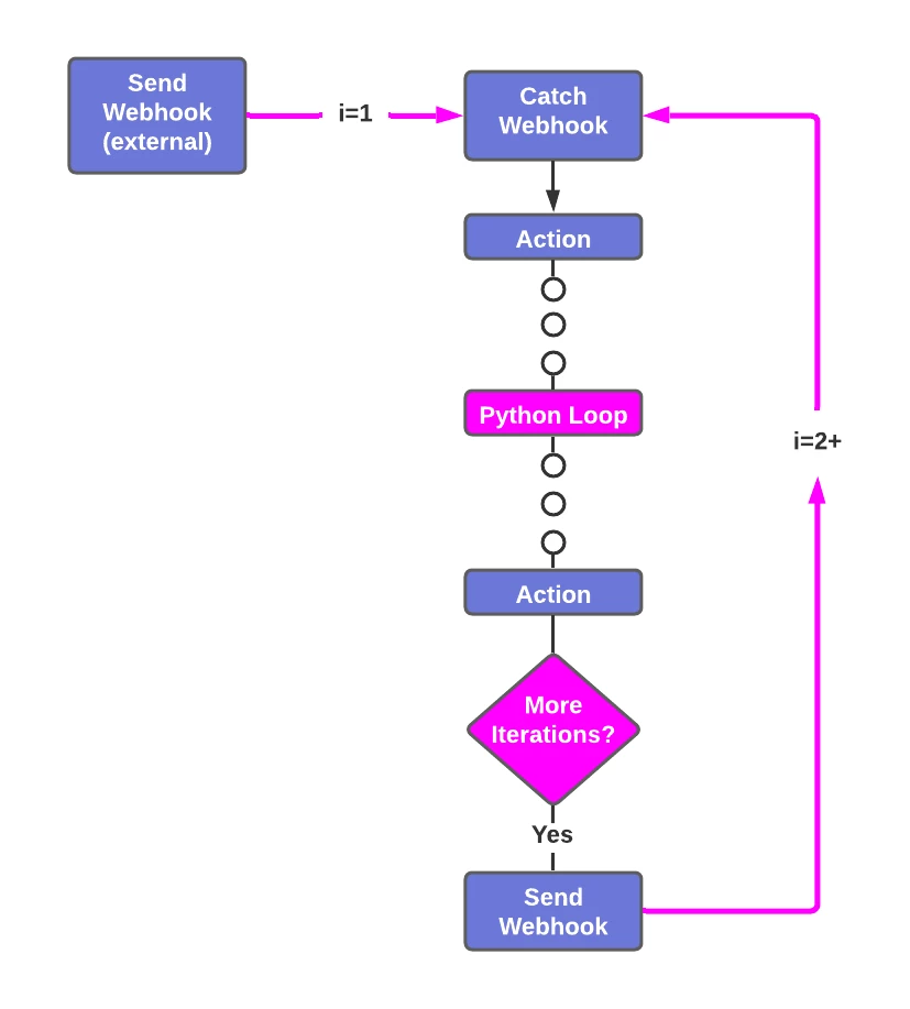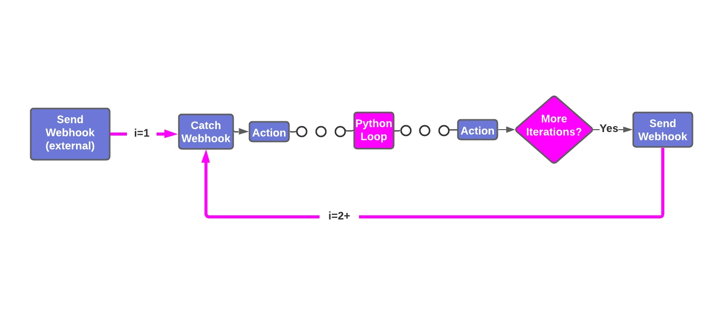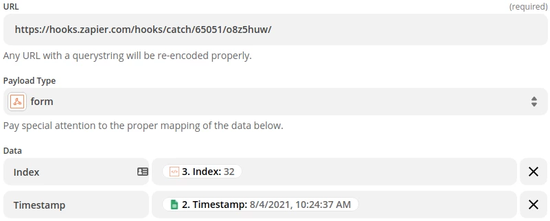 - If the zap passes the filter in step 5 then a webhook is used to send the index at which the next run of the Python loop will need to start from along with the timestamp needed to lookup the correct row in the Google sheet.