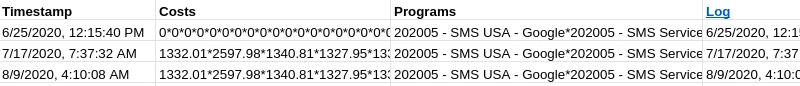 - The “Log” column in the Google Sheets row is updated with the responses from the cost update REST API calls made in Step 3