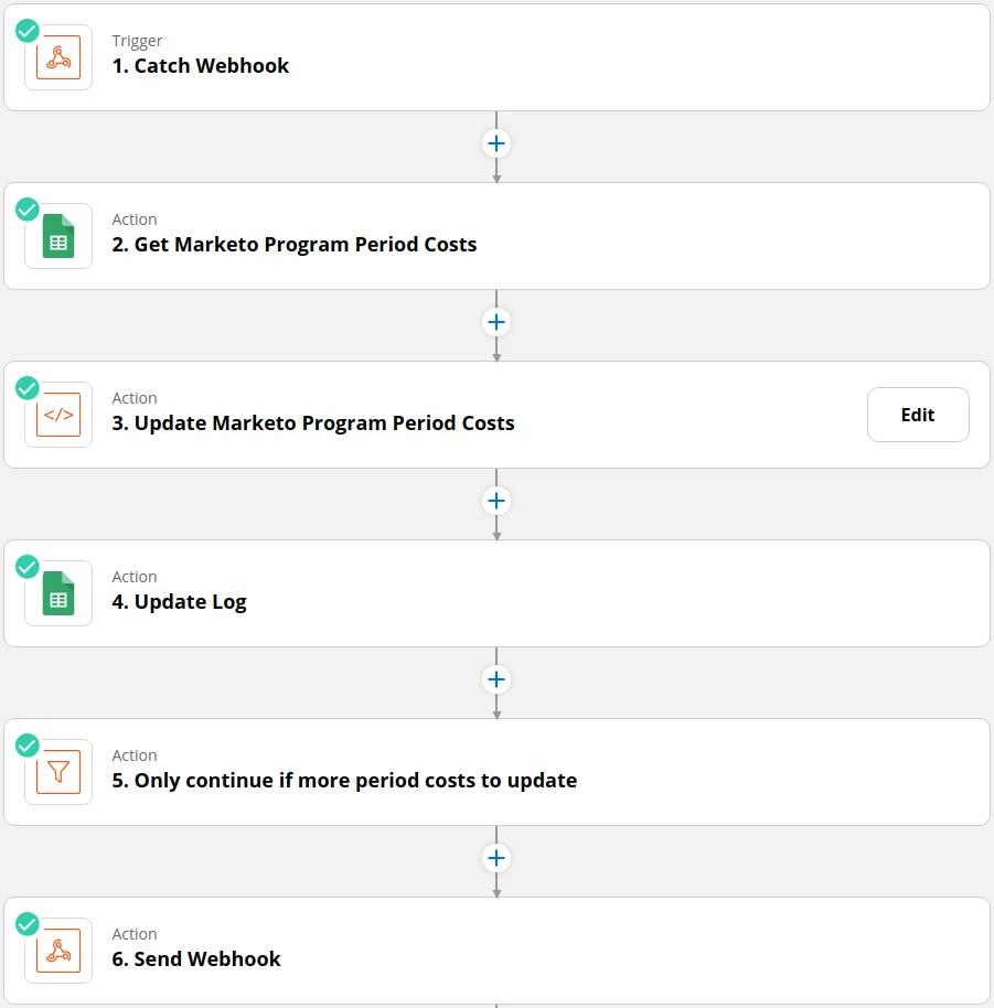 - The destination URL of this webhook is that of the “Catch Hook” trigger event in Step 1 of the zap so when Step 6 runs it will trigger the whole zap to run again. This zap will run until all costs have been updated, at which point it will finally finish at Step 5 when the “finished” boolean is True.