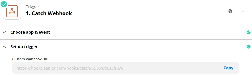 - The “Custom Webhook URL” under the “Set up trigger” section is the destination URL that is used in the Google Script function in the previous section to send the timestamp and index to start this zap.
