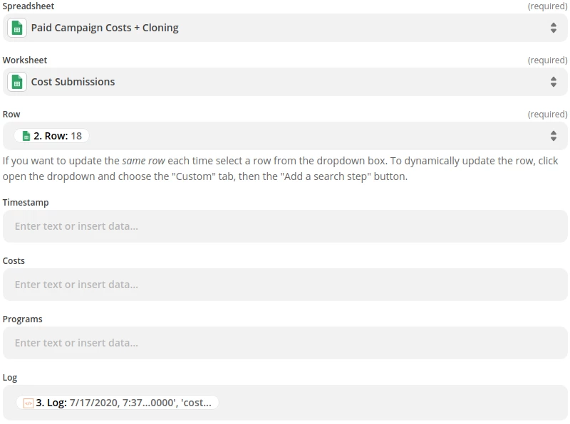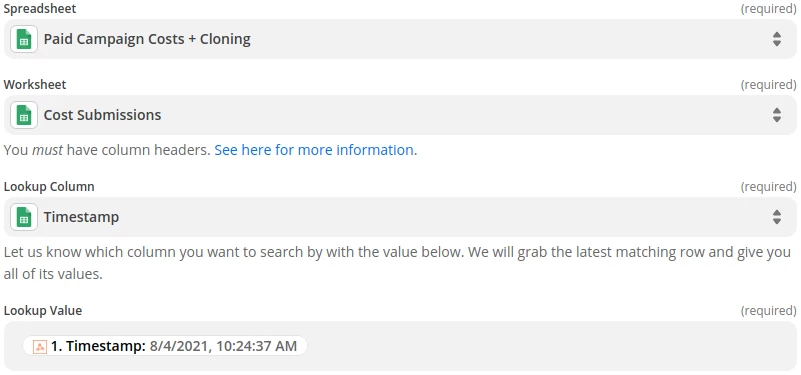 - The timestamp from Step 1 is used as a lookup field to get the programs and costs from the row that was submitted to trigger the zap