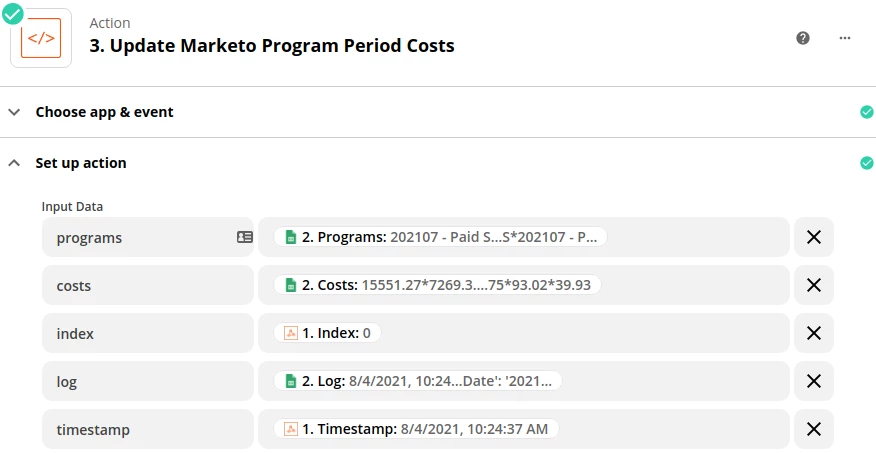 - The “Programs”, “Costs”, and “Log” cells from the Google sheet are pulled in as input data along with the “Index” and “Timestamp” from the webhook in Step 1