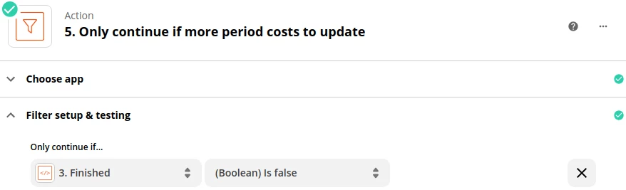 - A filter is used with the “finished” boolean value set in Step 3 so that the Zap will only progress to Step 6 if there are more programs that still need their costs updated.