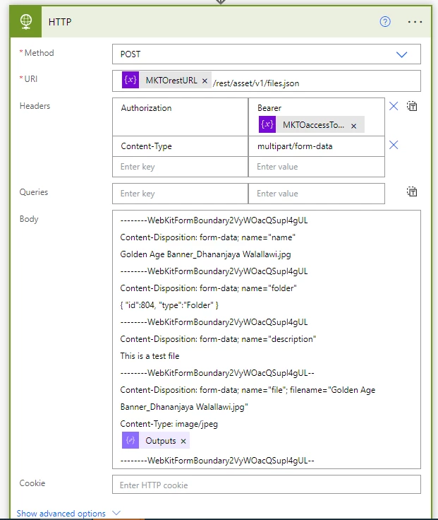I am trying to get the teams to upload the image via a Microsoft Form, and through a PowerAutomate flow, I am trying to do an HTTP request to upload that file into Marketo.