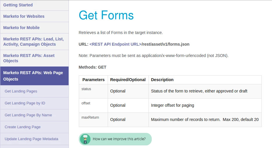 I am trying to access the recently released API endpoints for Forms and Landing Pages but it seems that the documentation is not yet complete. I am needing the URL's for the following: