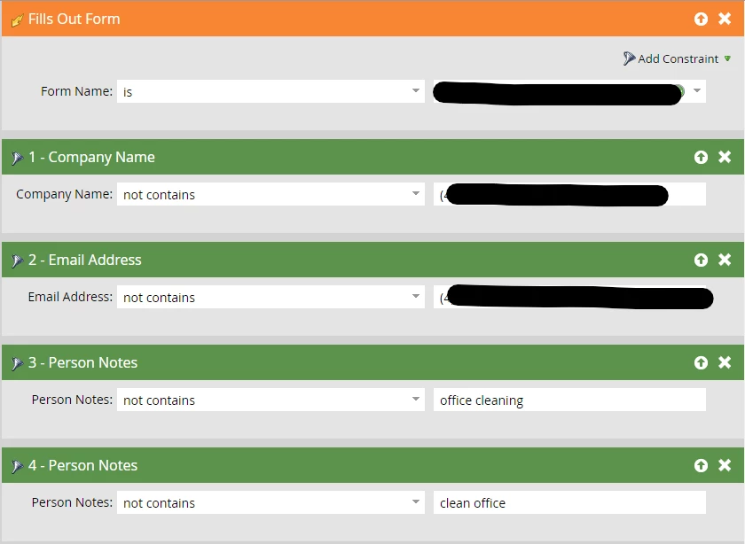I usually exclude employee submissions from the program, and thought I could do the same for anyone that adds specific keywords to the text box that's included on that form - however, all my tests are failing and I can't figure out why.