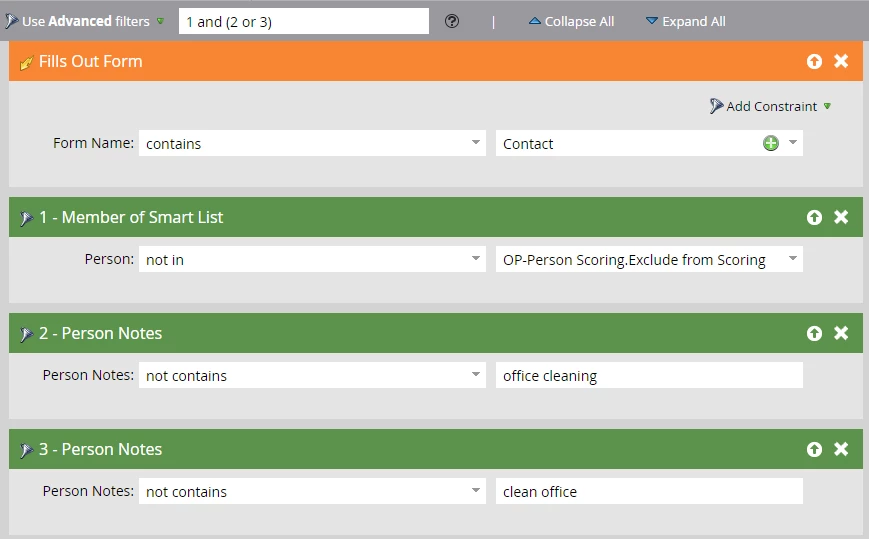 Also, because I can't stop the form itself being filled out and that Marketo will still see it, even if it doesn't add the lead to the program, I adjusted our Instant Qualifier campaign to include the keyword filters and updated logic: