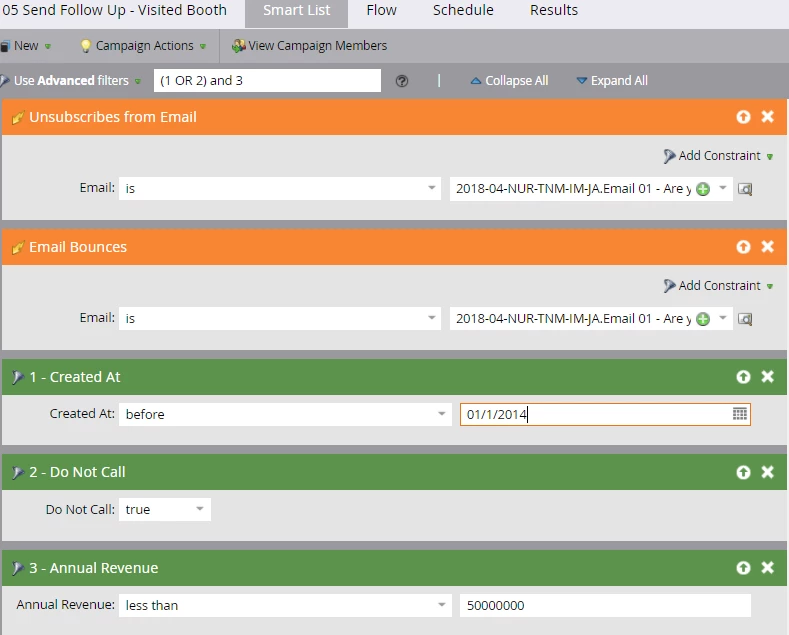 So if I want to see all people that are unsubscribing or bouncing from an email AND those that were either created before 2014 or marked as Do Not Call and have below $50 mill in revenue...