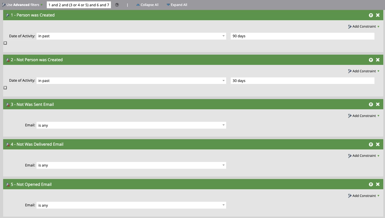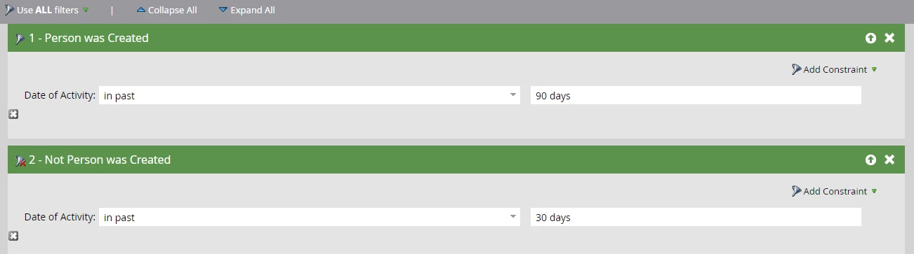 Using Both Person was Created AND Not Person was Created Filters
