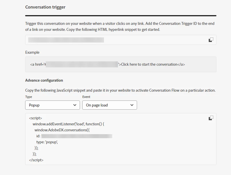 After you Publish your Conversational Flow, head to the Settings tab and the Conversation Trigger section. This is the code that lets you invoke the Conversational Flow using Javascript and have the modal with the Meeting Booking card appear on the page.