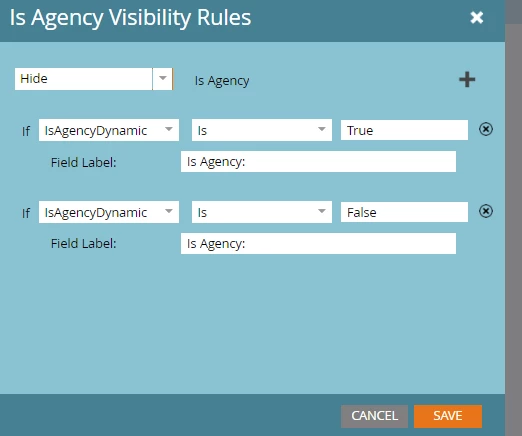 I am trying to make a form field visible only if there is a null value for another field in our instance. I have tried to implement using this thread: Form field conditional on current vlaue. However when I test it doesn't seem to work, the form value that I am trying to hide/show ( IS Agency) keeps showing no matter what.