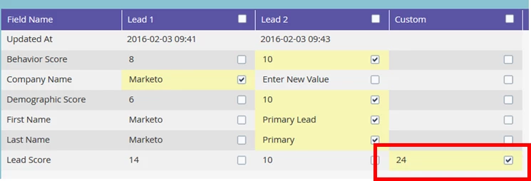 The default Lead Score field and all other custom score fields are not added up since you chose the score to keep during the merge. The complete activity logs will be merged in Marketo including membership in all programs. Last Interesting Moments will be merged in Sales Insight.
