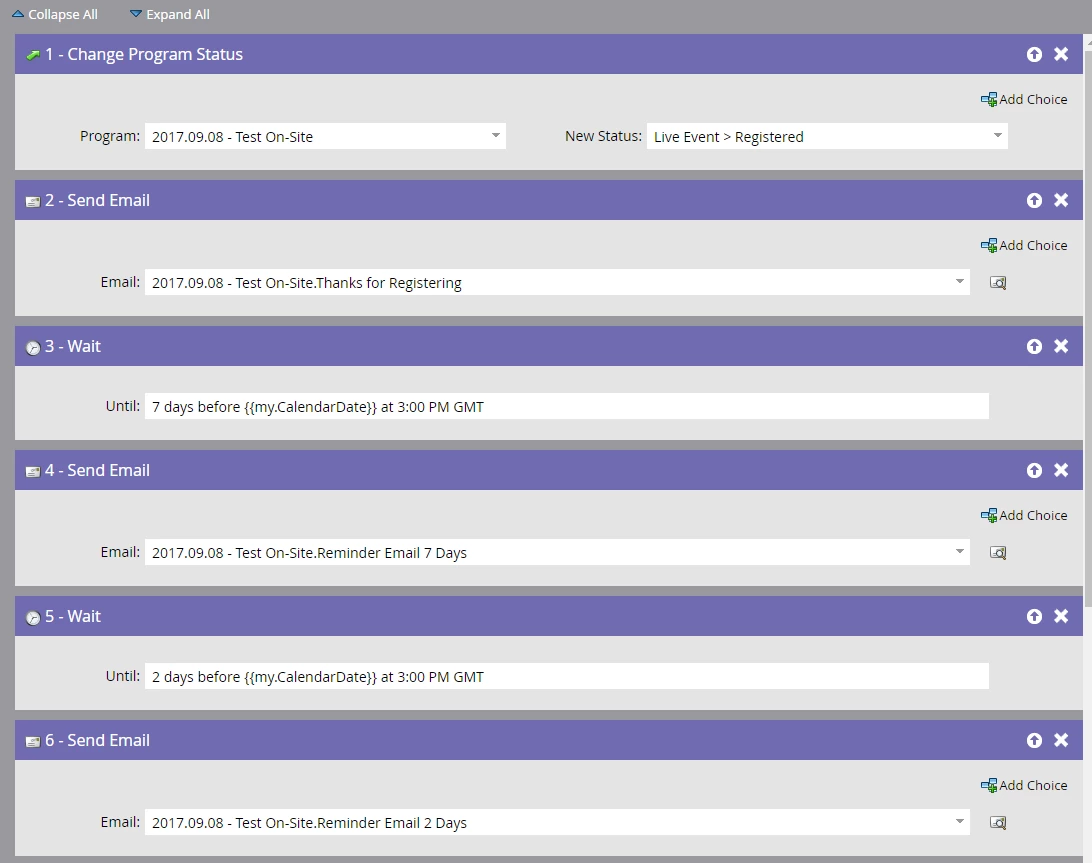 I think I actually figured out a way to do it where multiple campaigns are not required. I just created a smart list that has everyone that was sent the first email within the past 2 days in it. Then at each email step in the registration flow above, I include a choice 1 where if they are a member of said smart list, don't send the email. This has the added benefit of making sure that someone who registers 8 days before the event, still doesn't get a 7 day reminder email, which would be unnecessary. Furthermore, if the person registers on say Day 3, then they won't get the 7 day reminder email, or the 2 day reminder email.