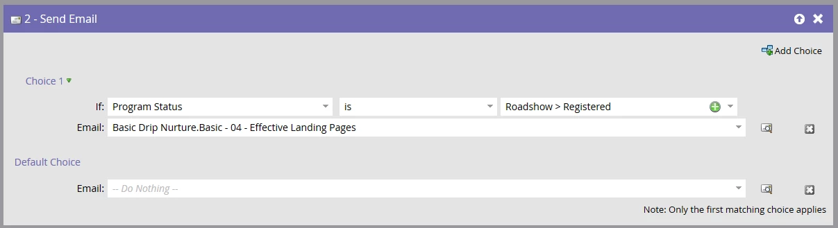 However, people sometimes wonder if this choice applies only to those who have that status within the program or if it applies to anyone who has that status in any program with that same channel. After testing, I confirmed that this only applies to the program that the smart campaign lives within. If you have one individual with Registered status in Program A and one individual with Registered status in Program B, a smart campaign built within Program A will only apply to the first individual; it would not apply to the second individual.