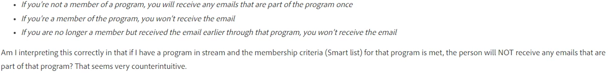 Am I interpreting this correctly in that if I have a program in stream and the membership criteria (Smart list) for that program is met, the person will NOT receive any emails that are part of that program? That seems very counterintuitive.