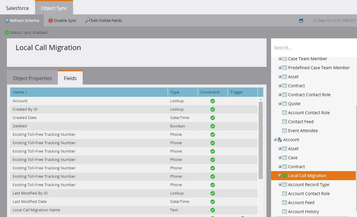 We have created a custom object in SFDC that stores a few fileds, some text and some phone. This object is linked to the Account objec tin SF.